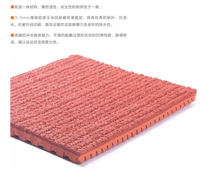 1.面層與底層材質相同,采用天然橡膠優制而成,綠色環保;2.高品質配合材料純度五星,配比五星,穩定性優異;