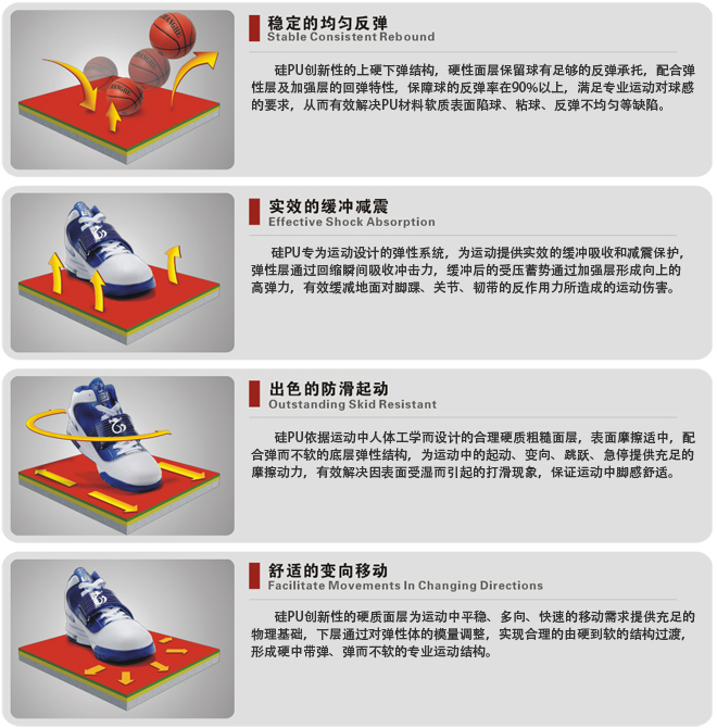 只有真正理解專業(yè)運動感覺的人才知道健康運動場地需要的是什么,正因為對健康運動的崇尚和熱愛,以及對專業(yè)運動感覺的追求,才能憑借雄厚的研發(fā)實力為硅PU注入了足以媲美木質(zhì)地板的運動特性。