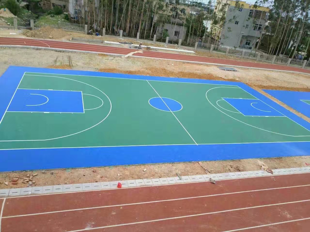 要注意密實度,平坦度、厚度,重復滾壓。待底層固化后開端面層攤鋪。通過二至三小時的固化,再次用滾碾子壓實,不平坦的當?shù)赜苗N刀敲打平坦,如鏝刀、滾碾子粘顆粒,沾少量稀釋劑起到潤滑的效果。 5、面層攤鋪 用epdm塑膠球場顆粒和專用膠水按4:1分量配比,用拌和器械在拌和區(qū)拌和均勻,用送料車送到預先劃好界限處,用刮尺攤鋪,用滾碾子壓實(在條件和面積合適的情況下,能夠運用專業(yè)攤鋪機攤鋪),要注意密實度,平坦度、厚度,重復滾壓。通過二至三小時的固化,再次用滾碾子壓實,不平坦的當?shù)赜苗N刀敲打平坦,如鏝刀、滾碾子粘顆粒,沾少量稀釋劑起到潤滑的效果。 6、標志線的測劃 依照圖紙規(guī)劃籃球場尺度進行丈量,劃出球場標志線。正確運用經(jīng)緯儀,鋼卷尺等丈量東西,按規(guī)范丈量斷定各種標志線的方位,重復丈量,校核承認無誤以達要求的精確度,方可用記號筆(特種鉛筆)在面層上劃線做記號。劃線后需經(jīng)體育工藝員復核。epdm塑膠球場直線部分用判定過的鋼卷尺(包含尺長校對、溫度校對)進行復核,承認契合規(guī)范后,方可按規(guī)則的標志噴漆。噴漆時,要重復查看標志線寬度是否契合規(guī)則,如不契合應及時調整。
