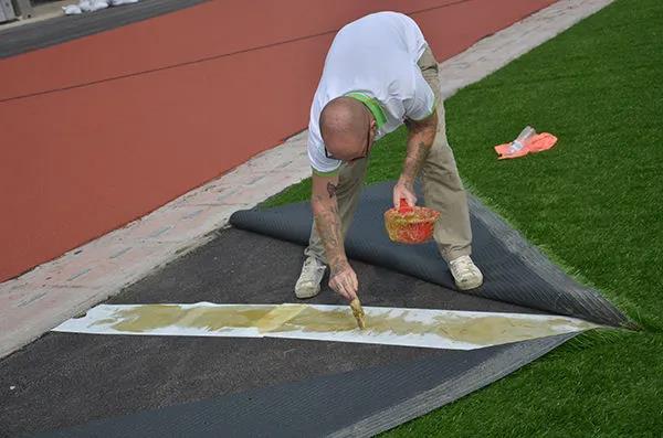 接下來就是把人工草坪用粘貼帶逐個的進(jìn)行粘貼,使用專門的馬貝膠水對草皮進(jìn)行鋪設(shè),然后還有進(jìn)行平整的擠壓,使其盡快的粘貼,中間不留痕跡,同時還有就是不同板塊的草坪之間進(jìn)行銜接,標(biāo)準(zhǔn)的要求是不能超過3mm。縫隙太大,在使用的過程中可能會產(chǎn)生很多的事故并且嚴(yán)重的情況下會危害運(yùn)動員的職業(yè)生涯。