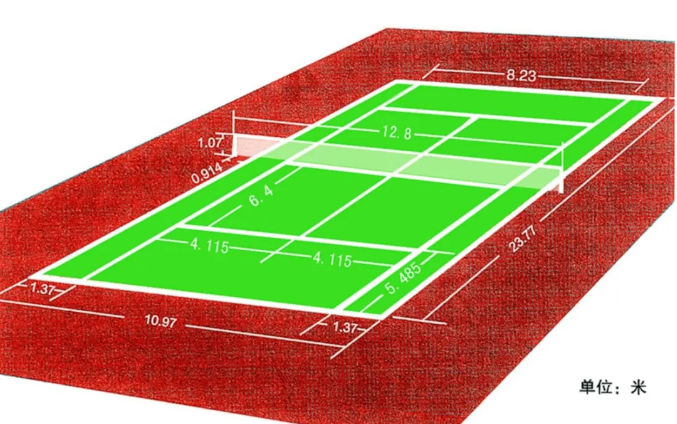 一片標準網球場地的占地面積不小于670平方米(長36.60米×寬18.30米),這一尺寸也是一片標準網球場地四周圍擋網或室內建筑內墻面的凈尺寸。在這個面積內,有效雙打場地的標準尺寸是:23.77米(長)×10.97米(寬),有效單打場地的標準尺寸是:23.77米(長)×8.23(寬),在每條端線后應留有余地不小于6.40米,在每條邊線外應留有余地不小于3.66米。在球場安裝網柱,兩柱中心測量,柱間距是12.80米,網柱頂端距地面是1.07米。