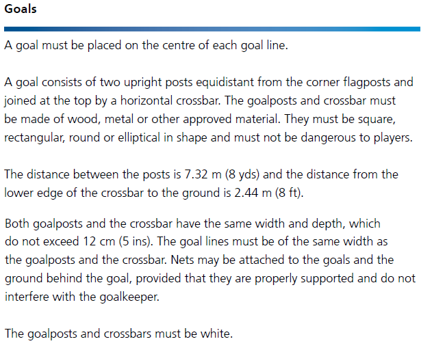 兩根球門柱和橫梁具有不超過12厘米(5英寸)的相同的寬度和厚度。球門線與球門柱和橫梁的寬度是相同的。球門網可以系在球門及球門后面的地上,并要適當撐起以不影響守門員。